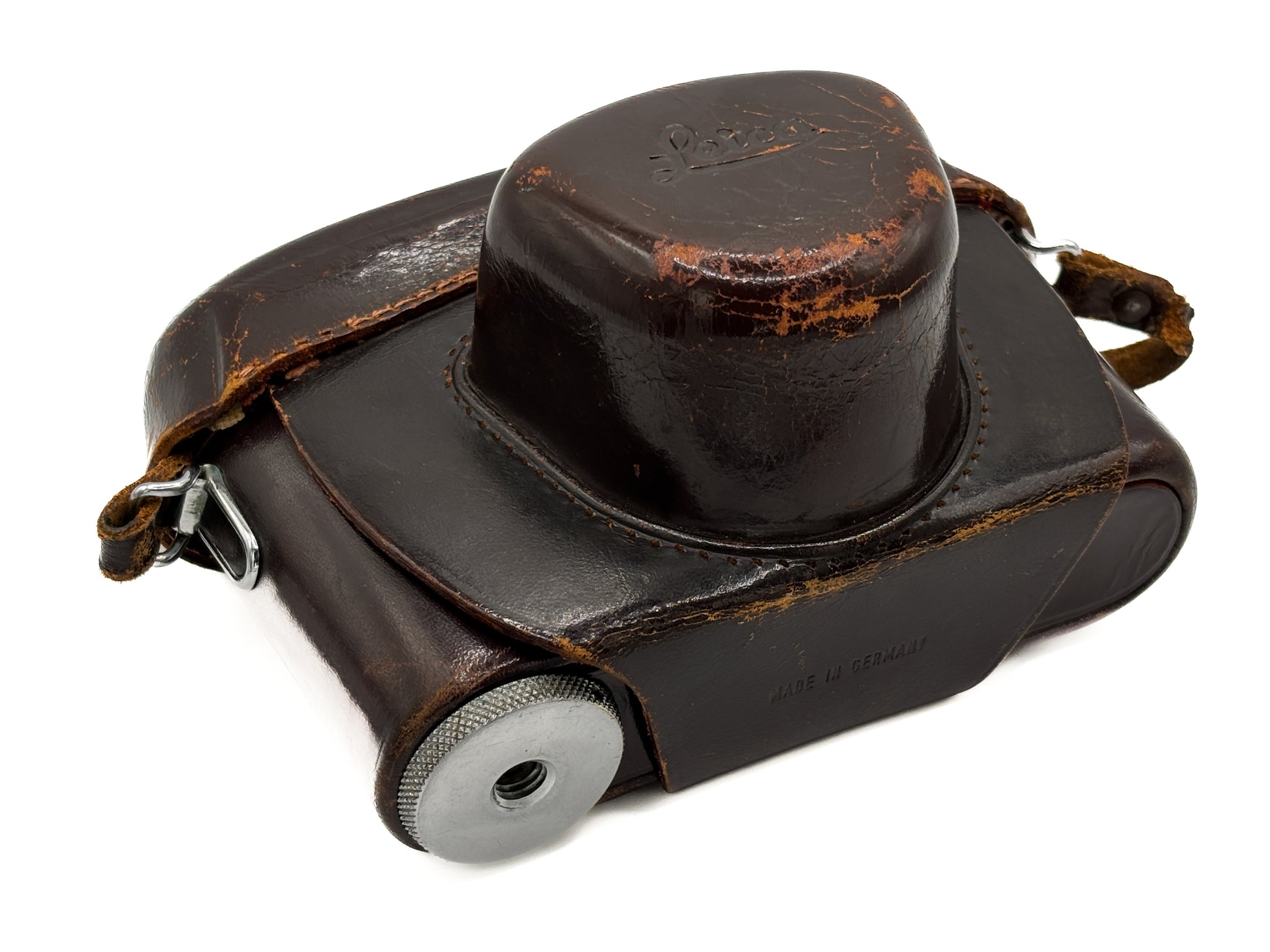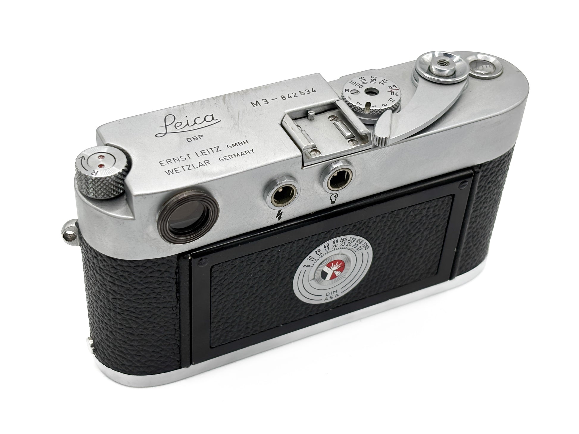 Description: Leica M3 Single Stroke from 1956 with age-related wear. The top plate shows signs of use from a Leica meter. The shutter functions well and the cleaning cloths are in good condition. The original viewfinder is installed and in good condition. A case, body cap, and Leica meter are included.