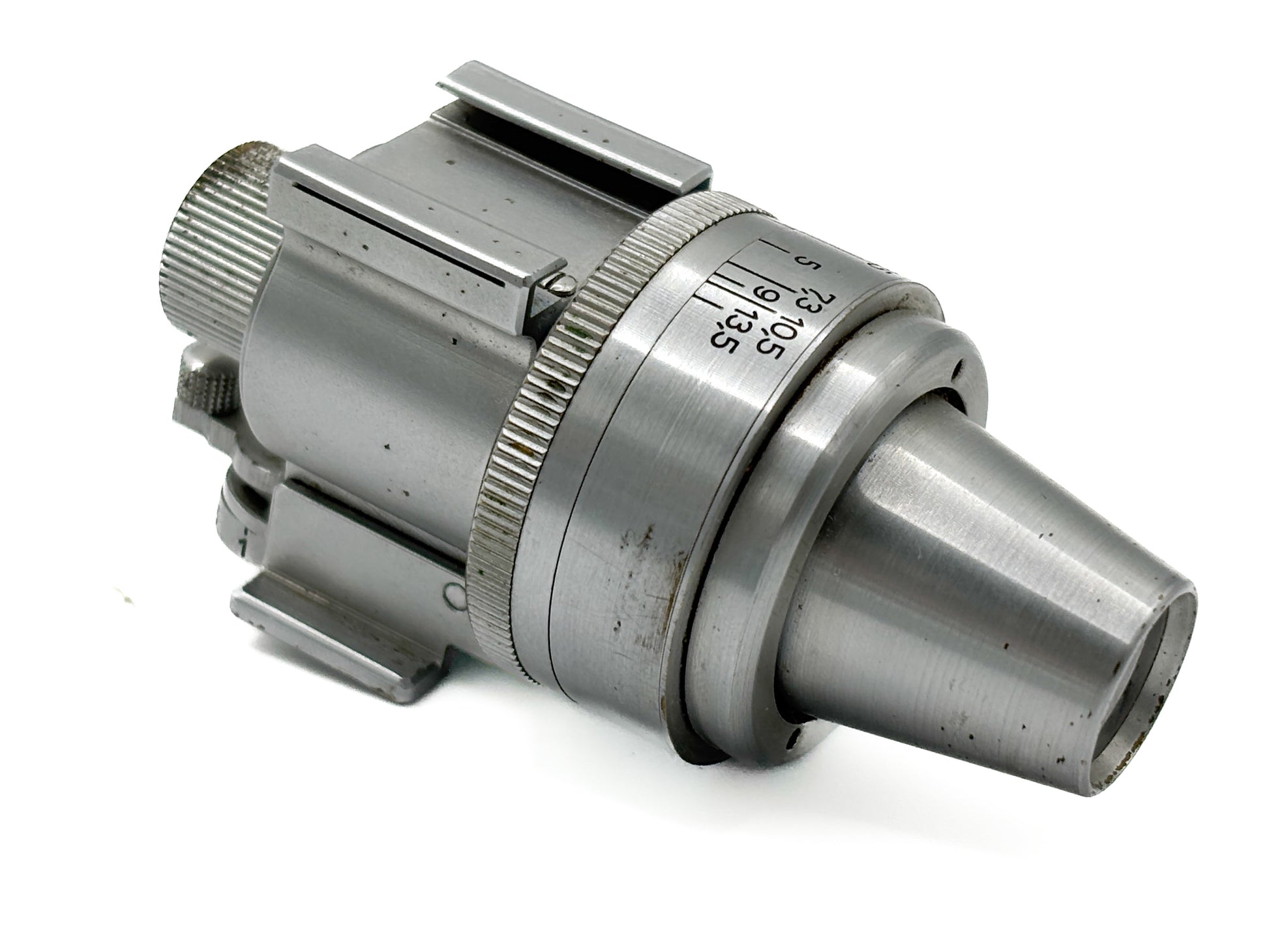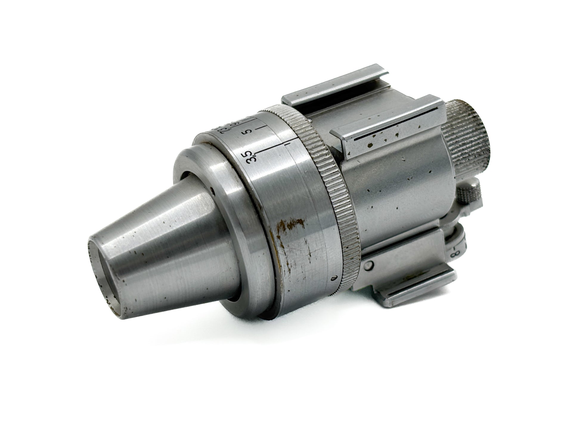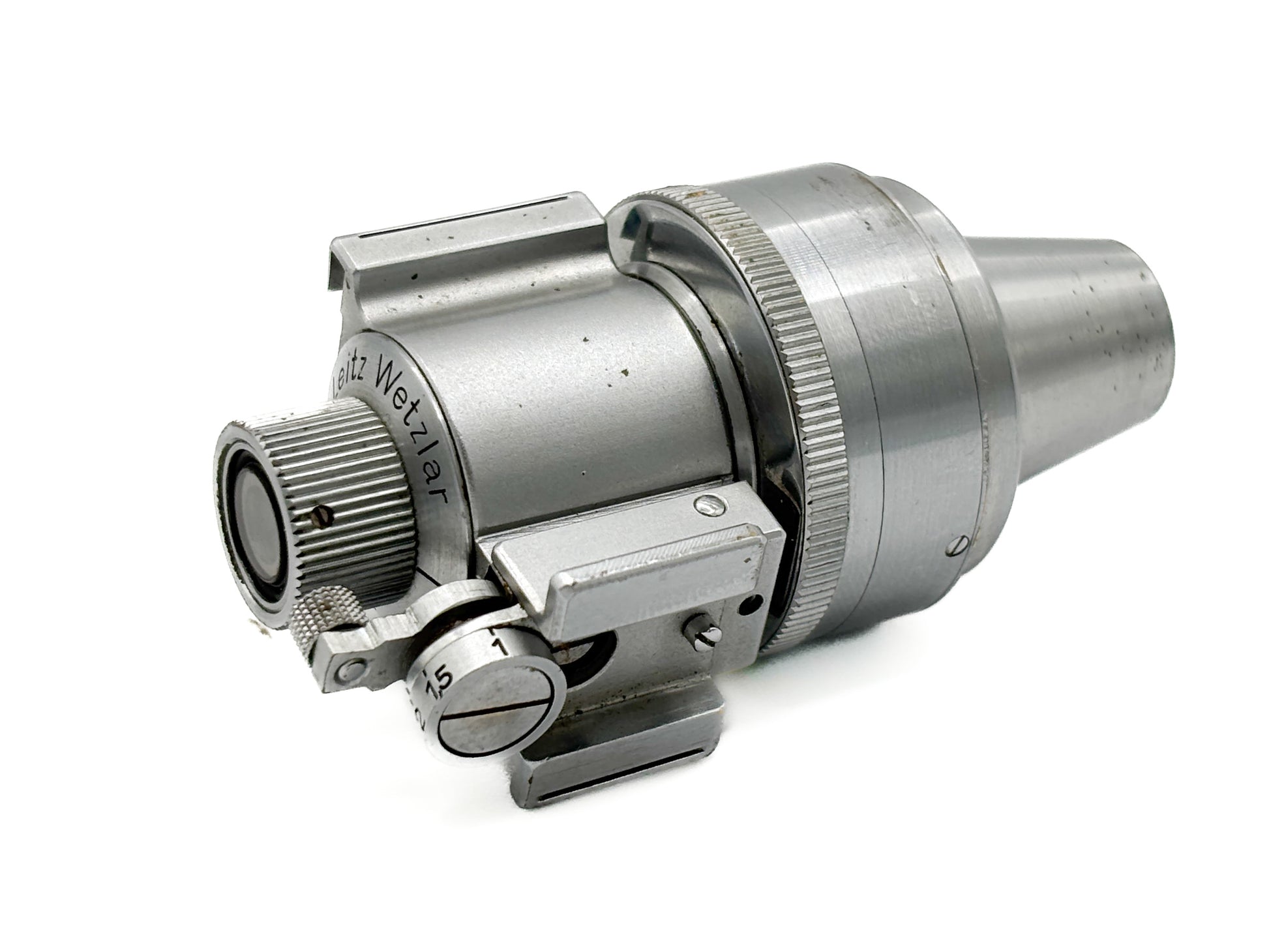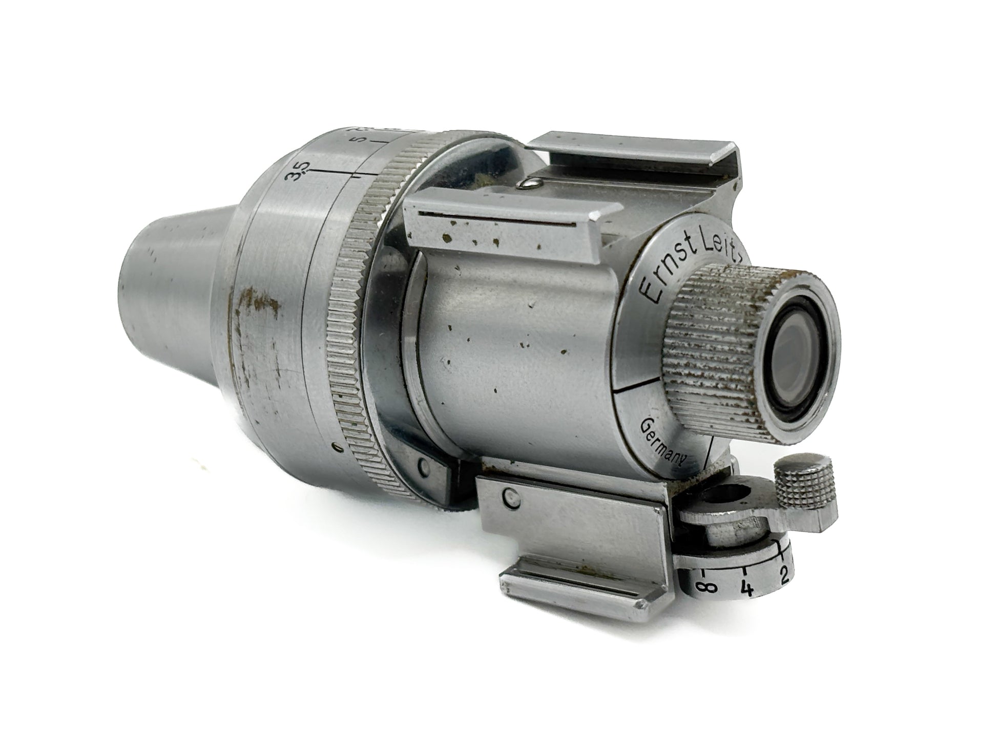 Description: Leica VIDOM viewfinder in chrome. Visible signs of wear. Lenses slightly cloudy.